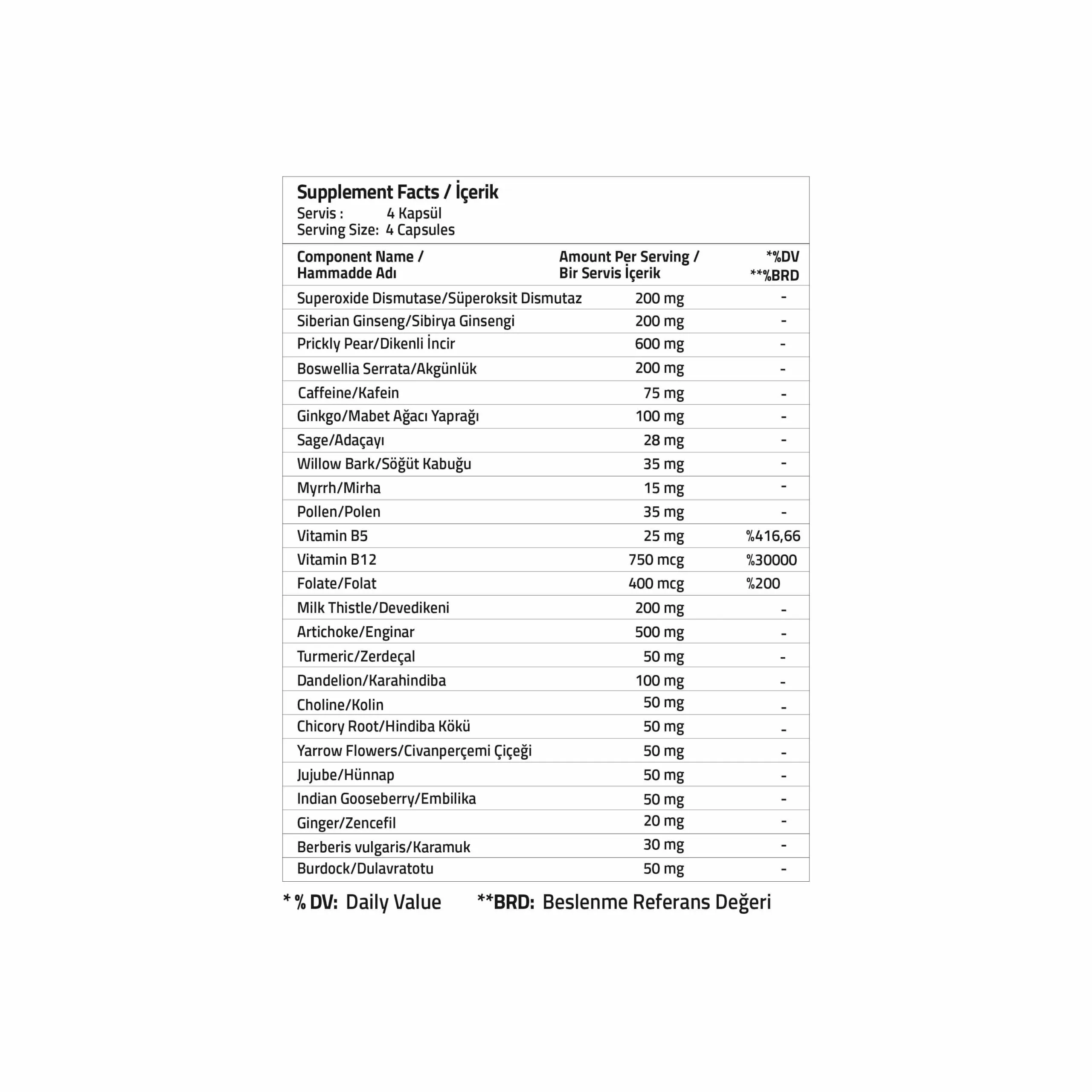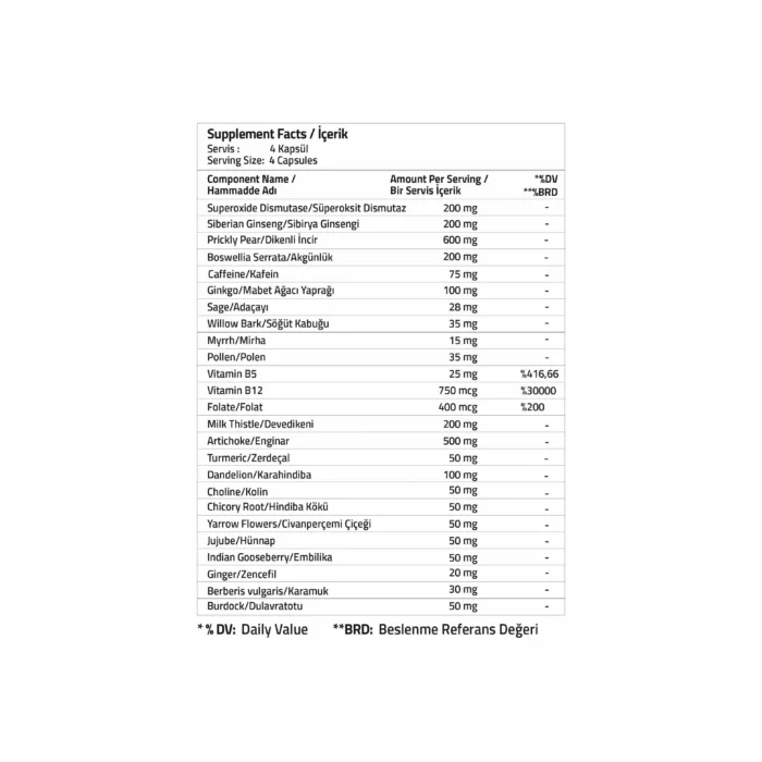 Süperoksit Dismutaz, Sibirya Ginsengi, Dikenli İncir, Akgünlük, Kafein, Mabet Ağacı Yaprağı, Adaçayı, Söğüt Kabuğu, Mirha, Polen, Vitamin B5, Vitamin B12, Folat, Devedikeni, Enginar, Zerdeçal, Karahindiba, Kolin, Hindiba Kökü, Civanperçemi Çiçeği, Hünnap, Embilika, Zencefil, Karamuk, Dulavratotu, Kapsül Bileşeni (Hidroksipropil metil selüloz, Su, Agar, Karagenan, Sodyum Sitratlar), Hacim Arttırıcı (Mikrokristalin selüloz), Topaklanma önleyici maddeler, (silikon dioksit, yağ asitlerinin magnezyum tuzları).