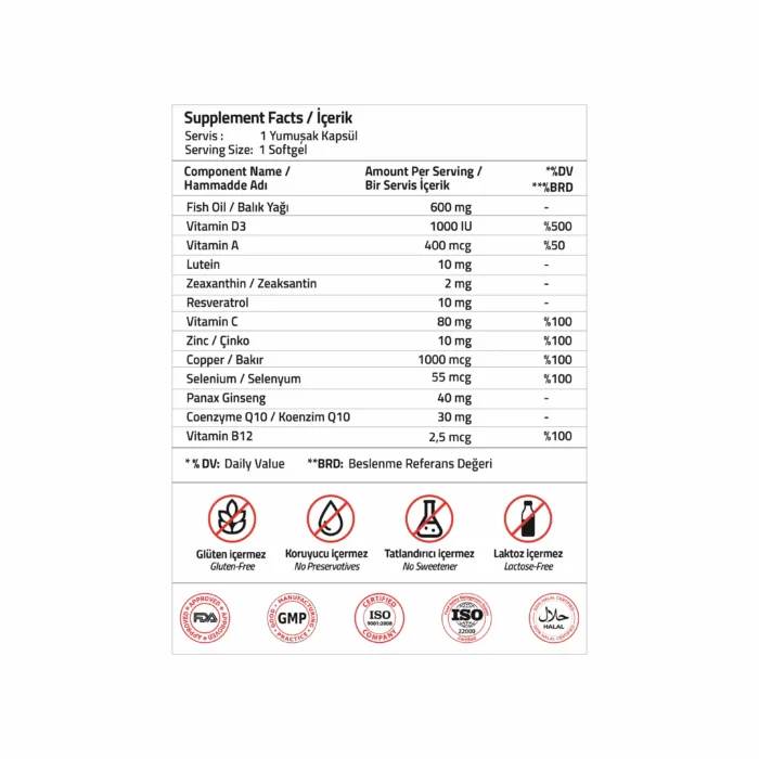 Balık Yağı, Kolekalsiferol, Retinil Palmitat, Lutein, Zeaksantin, Resveratrol, L-Askorbik Asit, Çinko Sülfat Monohidrat, Bakır Sülfat, Sodyum Selenit, Panax Ginseng, Koenzim Q10, Metilkobalamin, Zeytinyağı, Sığır Jelatini , Gliserin, Deiyonize Su,Alfa-Tokoferol (E 307) Renklendirici; Allura Red AC (E 129)).