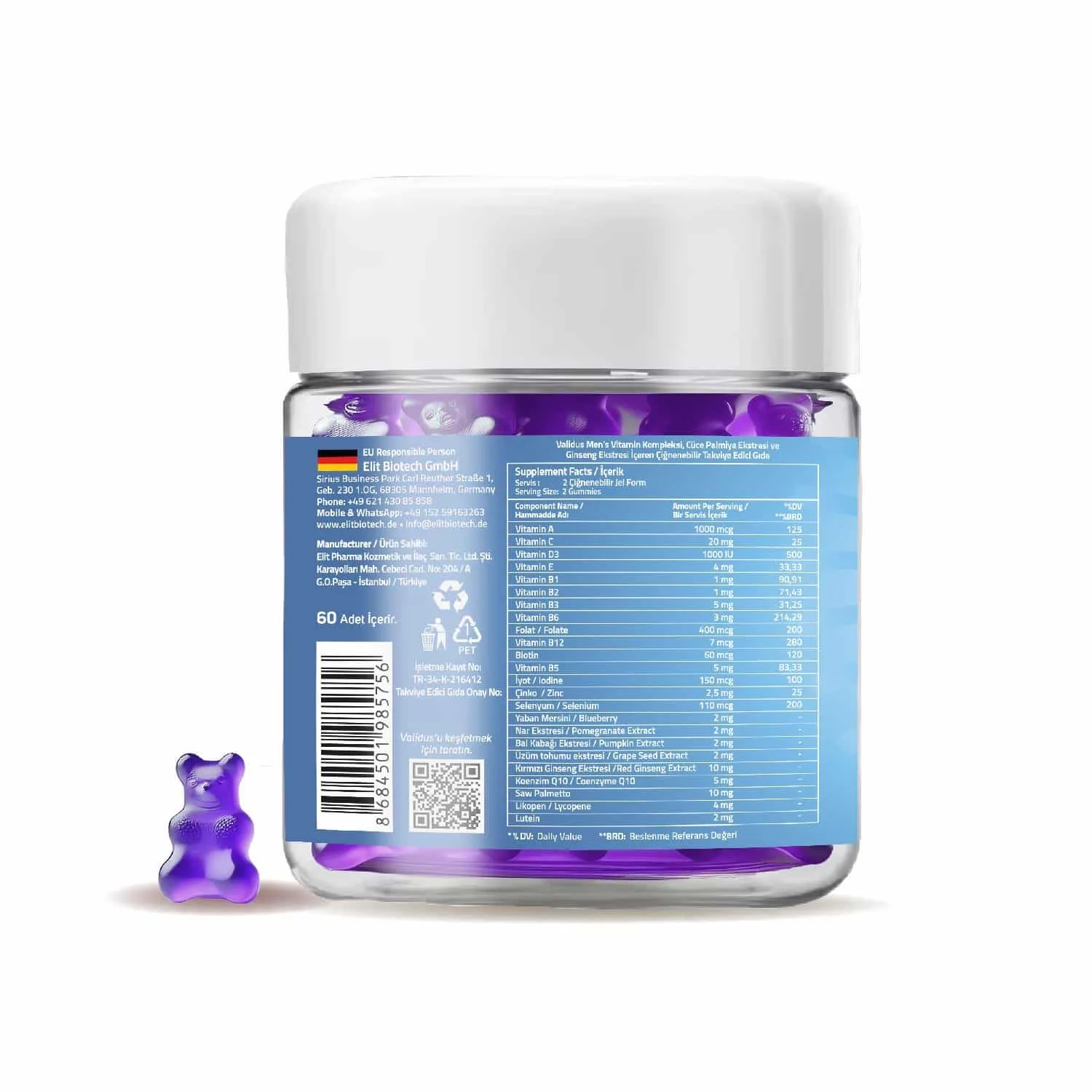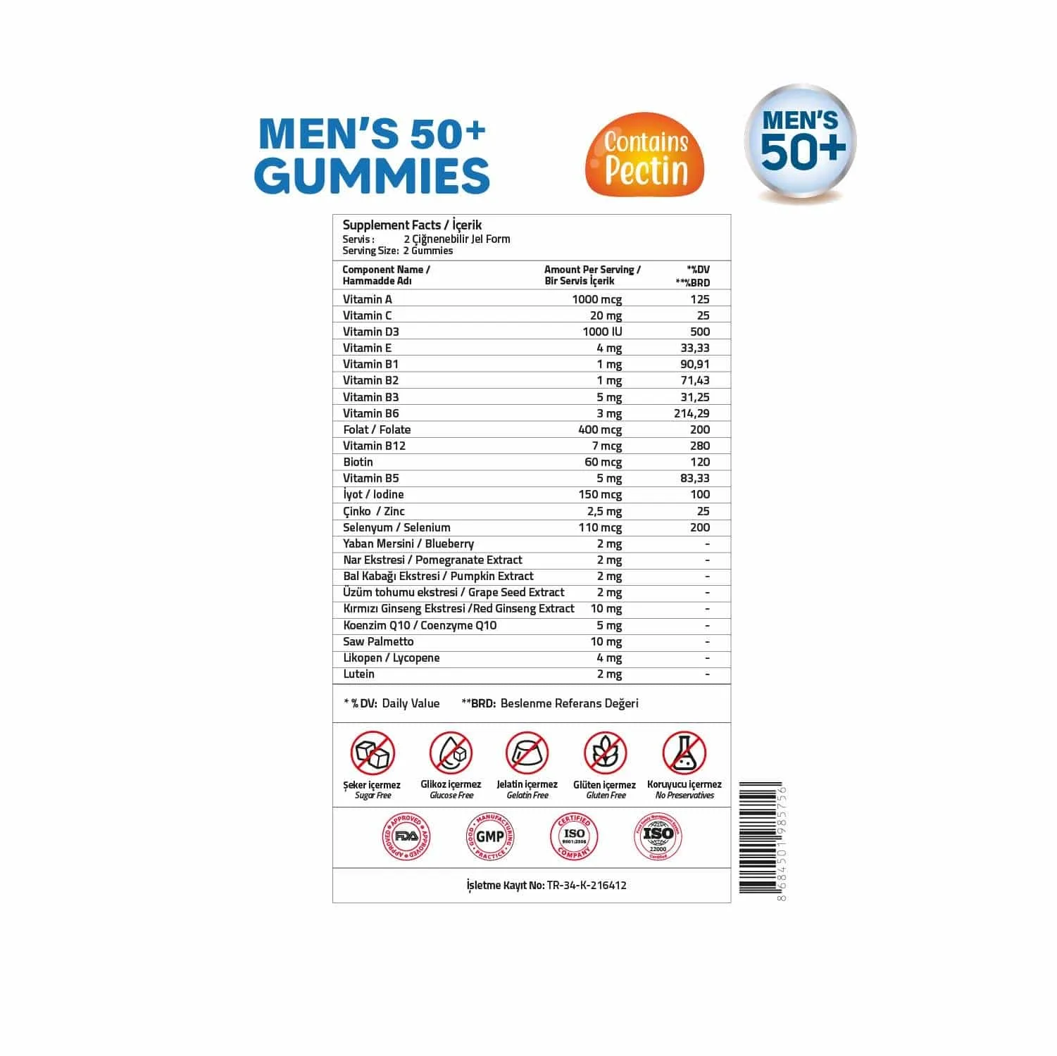 Retinil Asetat, L-Askorbik Asit, Kolekalsiferol, [DL] -α-tokoferil asetat, Tiamin Mononitrat, Riboflavin, Nikotinamid, Piridoksin Hidroklorür, Kalsiyum L-Metilfolat, Metilkobalamin, D-Biotin, Kalsiyum D-pantotenat, Potasyum İyodür, Çinko Sitrat, Sodyum Selenit, Yaban Mersini Ekstresi, Nar Ekstresi, Bal Kabağı Ekstresi, Üzüm Tohumu Ekstresi, Kırmızı Ginseng Ekstresi, Koenzim Q10, Cüce Palmiye Ekstresi, Likopen, Lutein, Stabilizör: Maltitol, Deiyonize Su, Jelleştirici: Pektin, Asitlik Düzenleyici: Sitrik Asit, Aroma Verici: Elma Aroması, Tatlandırıcı: Sukraloz, Renklendirici: Pancar Kökü Kırmızısı.