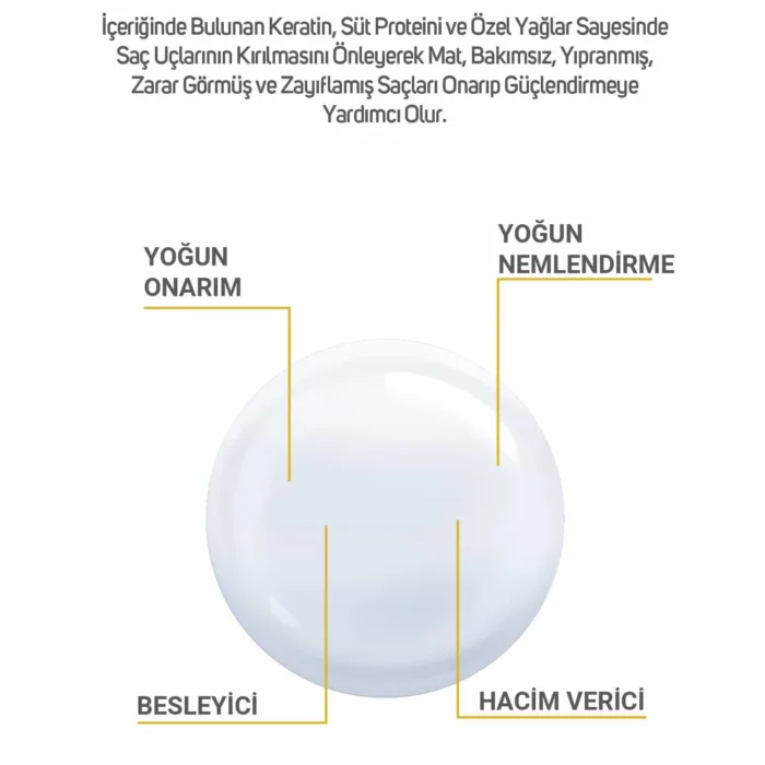 İçeriğinde bulunan keratin, süt proteini ve özel yağlar sayesinde saç uçlarının kırılmasını önleyerek mat, bakımsız, yıpranmış, zarar görmüş ve zayıflamış saçları onarıp güçlendirmeye yardımcı olur.