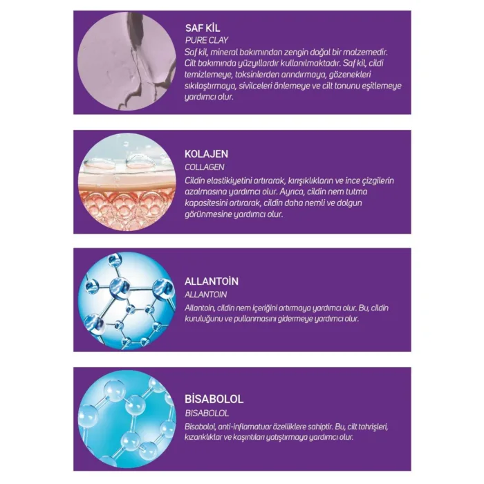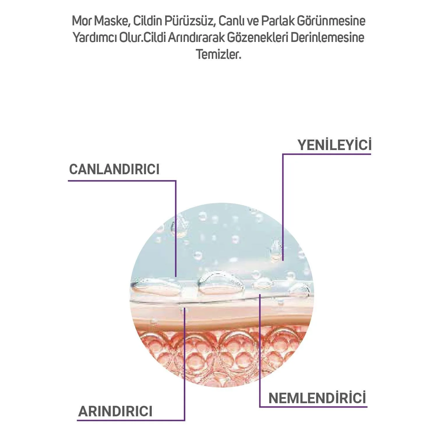 Mor maske, cildin pürüzsüz, canlı ve parlak görünmesine yardımcı olur. Cildi arındırarak gözenekleri derinlemesine temizler.
