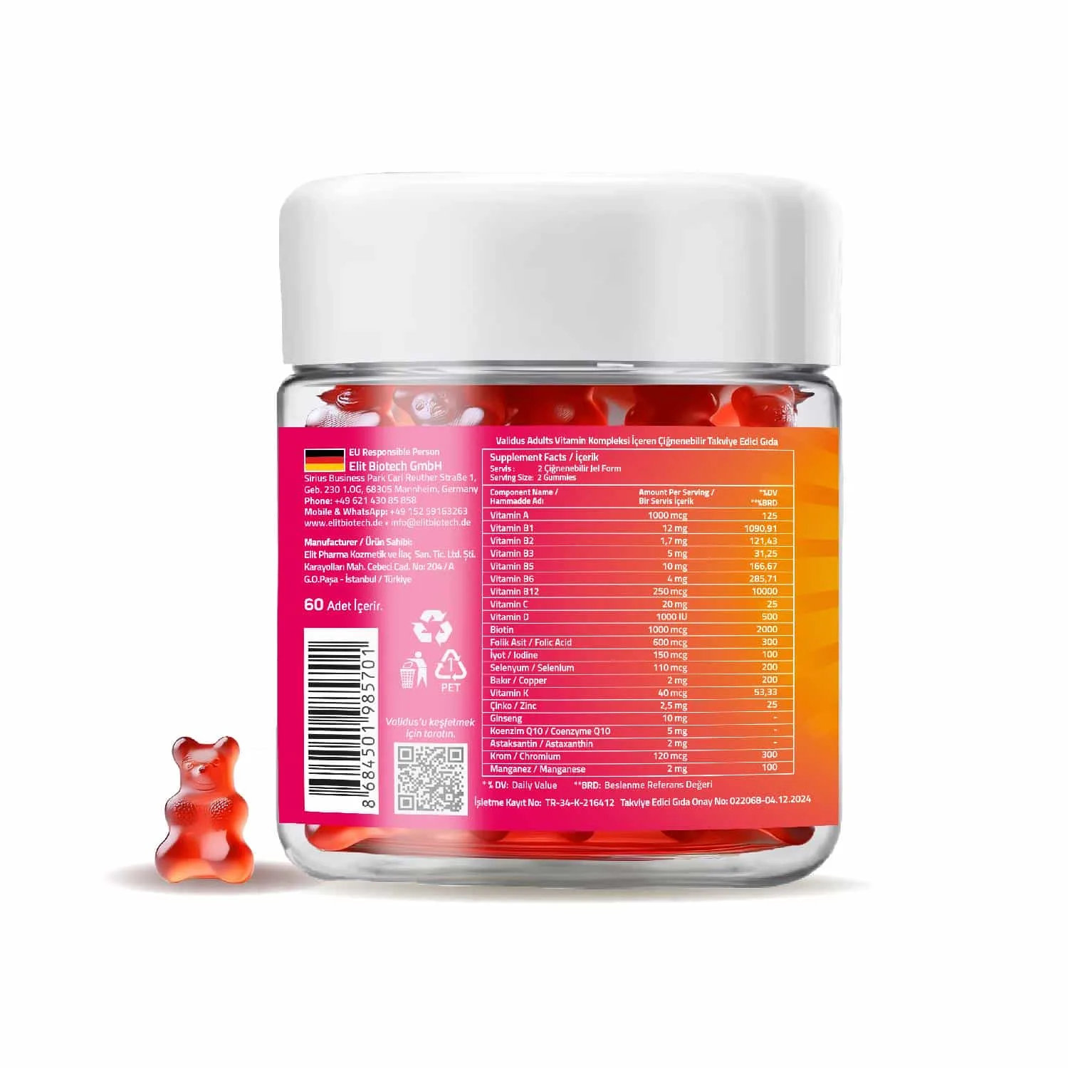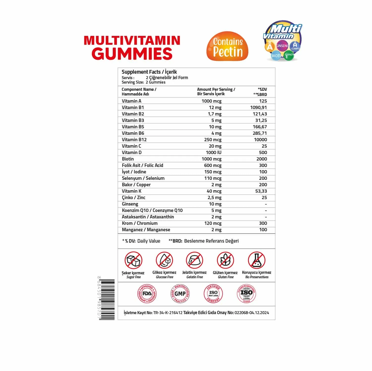 İçindekiler: Retinil Asetat, Tiamin Mononitrat, Riboflavin, Nikotinamid, Kalsiyum D-pantotenat, Piridoksin Hidroklorür, Metilkobalamin, L-Askorbik Asit, Kolekalsiferol, D-Biotin, Pteroilmonoglutamik asit, Potasyum İyodür, Sodyum Selenit, Bakır Sülfat, Menakuinon 7, Çinko Sitrat, Ginseng Ekstresi, Koenzim Q10, Astaksantin, Krom Pikolinat, Manganez Sülfat, Stabilizör: Maltitol, Deiyonize Su, Jelleştirici: Pektin, Asitlik Düzenleyici: Sitrik Asit, Aroma Verici: Orman Meyvesi Aroması, Tatlandırıcı: Sukraloz, Renklendirici: Pancar Kökü Kırmızısı.