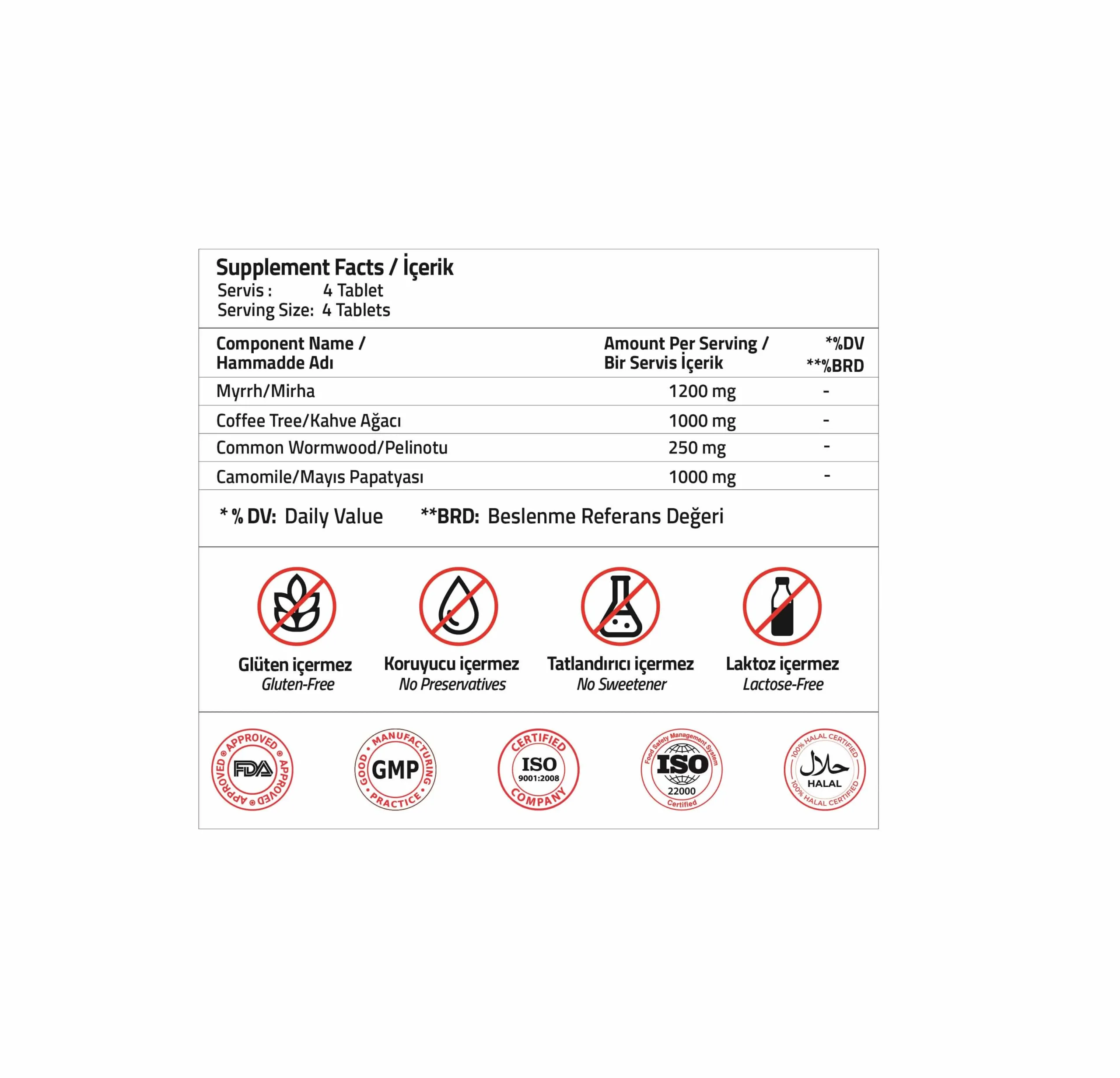 İçindekiler: Mirha Ekstresi, Kahve Ağacı Ekstresi, Pelinotu Ekstresi, Mayıs Papatyası Ekstresi, Hacim Arttırıcı (Mikrokristalin selüloz), stabilizör (polivinilpirolidon), Topaklanmayı önleyiciler (silikon dioksit, yağ asitlerinin magnezyum tuzları)