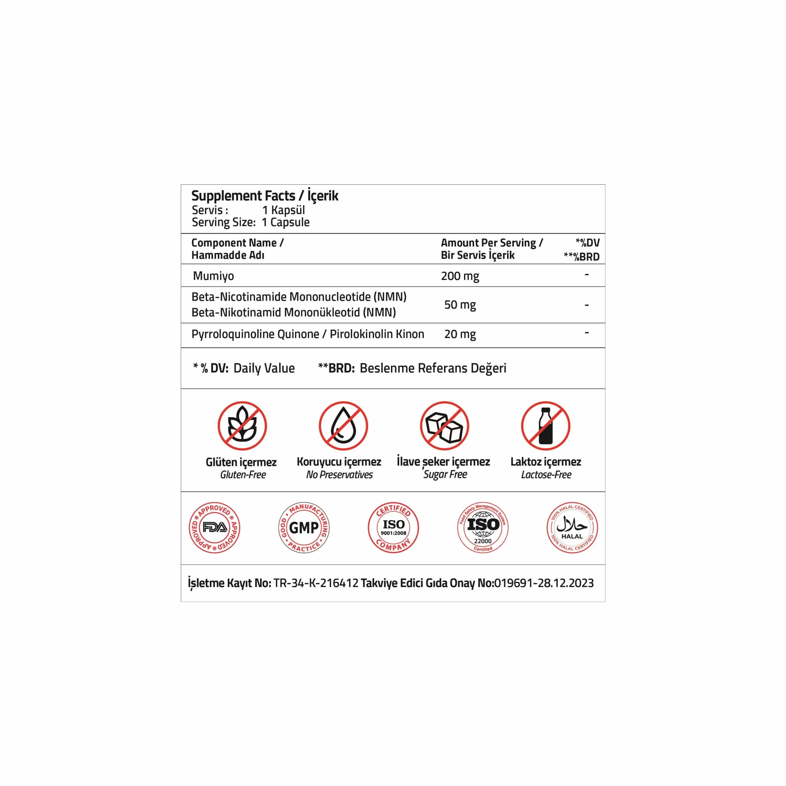 İçindekiler: Mumiyo, Mikrokristalin selüloz (E 460(i)), Kapsül Bileşeni (Hidroksipropil Metil Selüloz), Beta-Nikotinamid Mononükleotid (NMN), Pirolokinolin Kinon, Yağ Asitlerinin Magnezyum Tuzları: Magnezyum Stearat (E 470b), Silikon Dioksit (E 551).