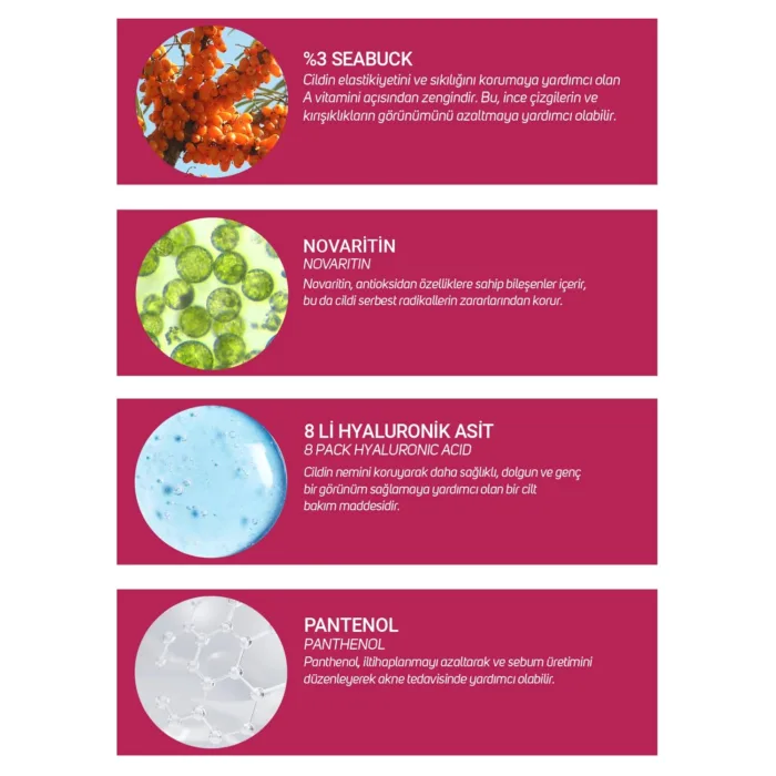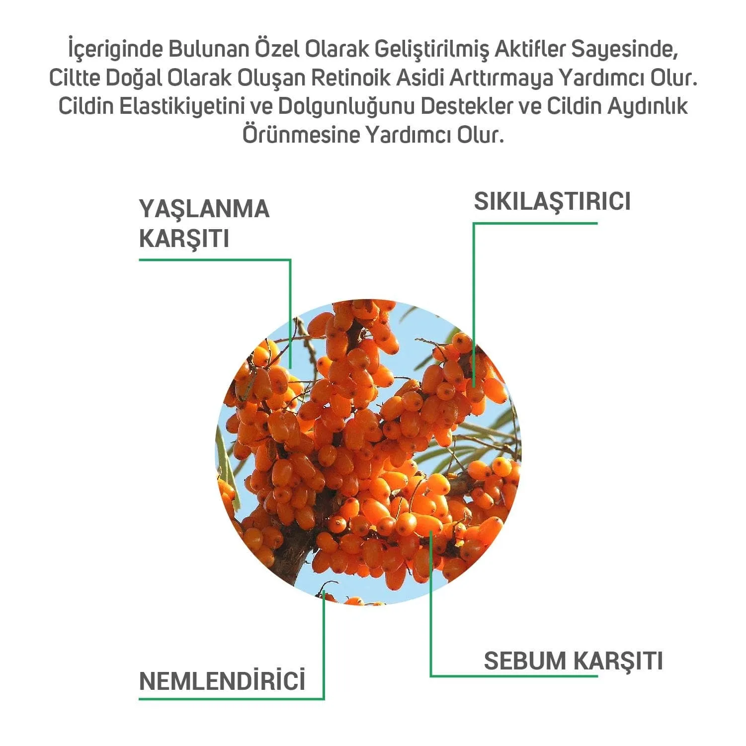 İçeriğinde bulunan özel olarak geliştirilmiş aktifler sayesinde, ciltte doğal olarak oluşan retinoik asidi arttırmaya yardımcı olur. Cildin elastikiyetini ve dolgunluğunu destekler ve cildin aydınlık görünmesine yardımcı olur.