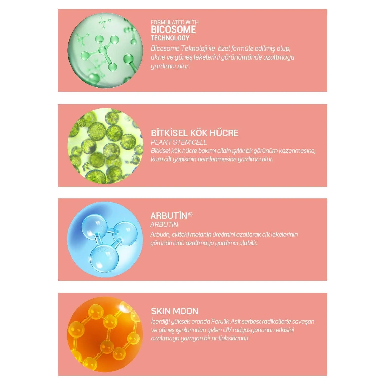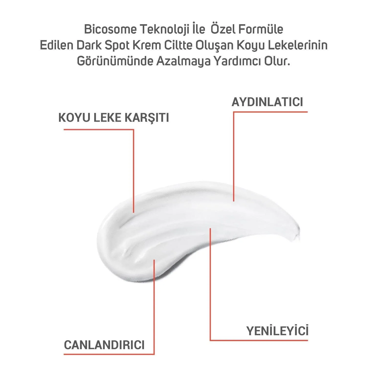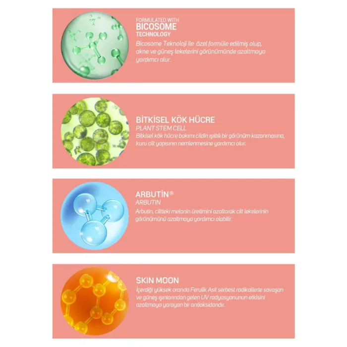 Bicosome Teknoloji ile özel olarak elde edilen patentli aktifler sayesinde ciltte oluşan koyu leklerin azaltılmasına yardımcı olur. Yaşlanma, güneş vb. dış etkenlerden kaynaklanan lekelerin görünümünün azalmasına ve cildin gün boyu nemli kalmasına yardımcı olur.