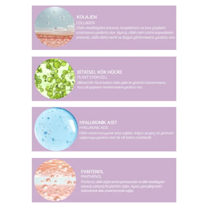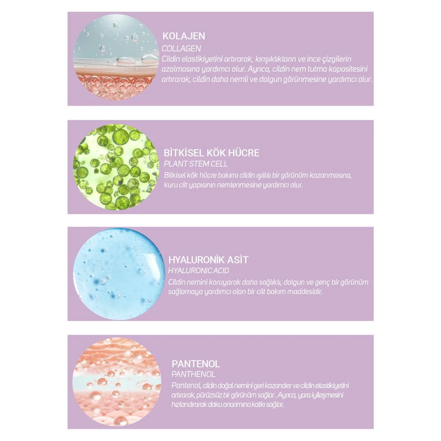 İçeriğinde bulunan %10 Kolajen ile cildin nemlendirilmesine, canlı ve parlak bir görünüme kavuşmasına yardımcı olur