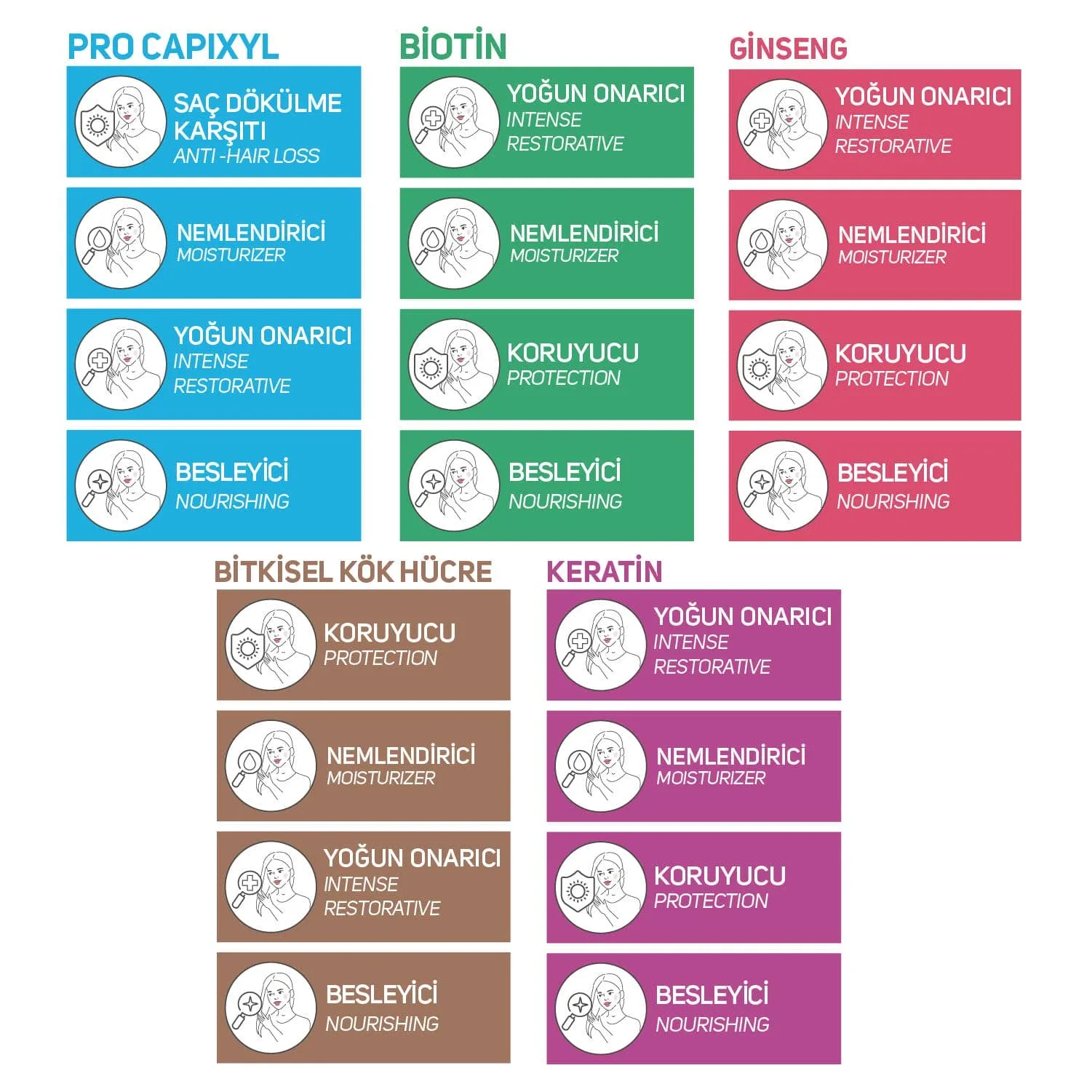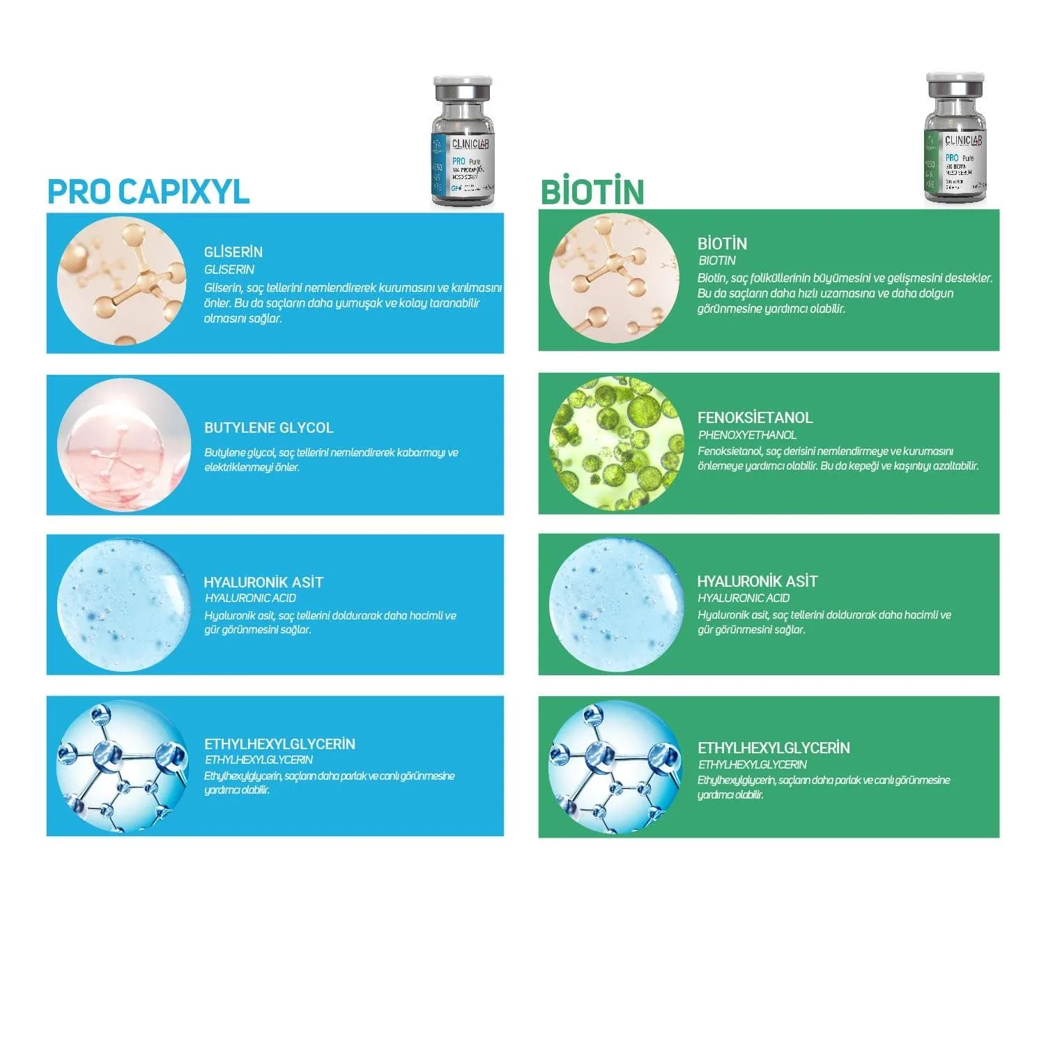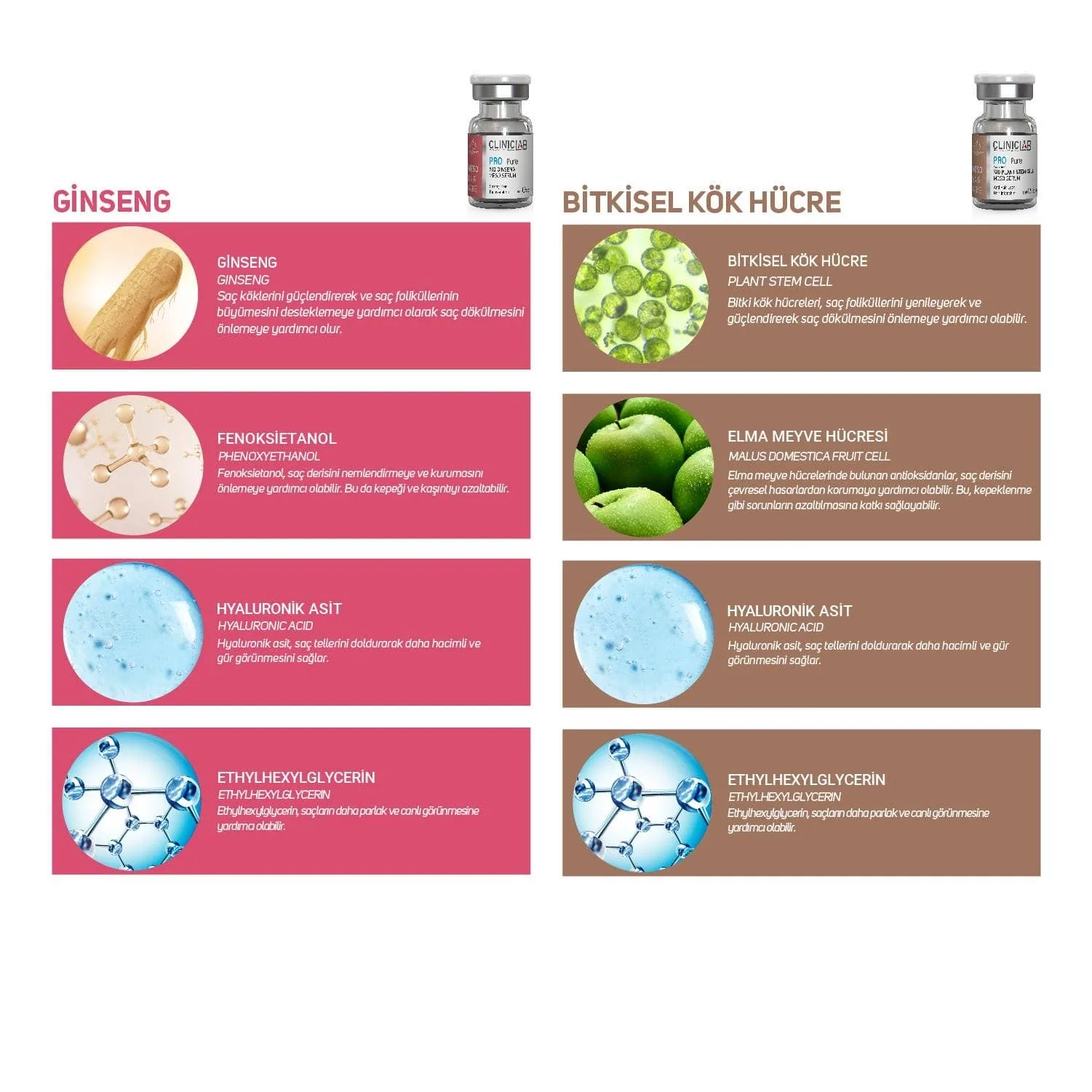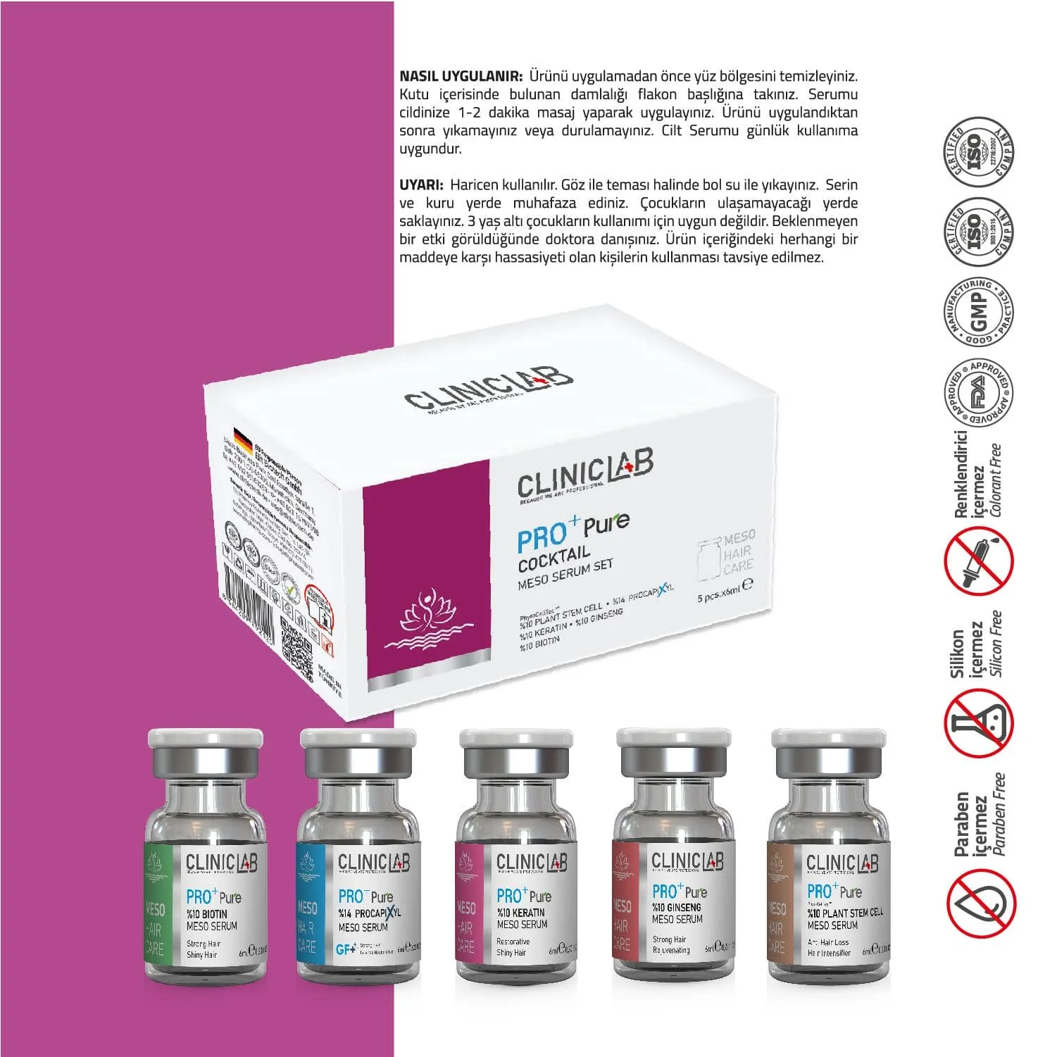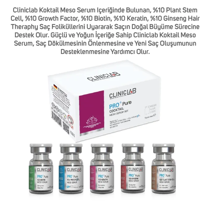 %10 Plant Stem Cell Meso Serum: Aqua, Isomalt, Phenoxyethanol, Malus Domestica Fruit Cell Culture Extract, Hyaluronic Acid, Ethylhexylglycerin, Xanthan Gum, Pisum Sativum Extract, Sodium Benzoate, Glycerin, Lecithin, Phytol. %14 ProcapiXyl Meso Serum: Aqua, Butylene Glycol, Glycerin, Phenoxyethanol, Hyaluronic Acid, Ethylhexylglycerin, PPG-26-Buteth-26, PEG-40 Hydrogenated Castor Oil, Sodium Metabisulfite, Larix Europaea Wood Extract, Glycine, Dextran, Zinc Chloride, Camellia Sinensis Leaf Extract, Acetyl Tetrapeptide-3, Apigenin, Trifolium Pratense Flower Extract, Oleanolic Acid, Biotinoyl Tripeptide-1. %10 Keratin Meso Serum: Keratin Meso Serum, saç tellerinin yapısında bulunan keratin saçlara esneklik kazandırır. Keratin sayesinde saç kopması en aza indirilerek, saçların sağlıklı uzamasına canlı ve parlak görünmesine yardımcı olur. %10 Ginseng Meso Serum:Aqua, Propylene Glycol, Panax Ginseng Extract, Phenoxyethanol, Hyaluronic Acid, Ethylhexylglycerin. %10 Biotin Meso Serum: Aqua, Biotin, Hyaluronic Acid, Phenoxyethanol, Ethylhexylglycerin.