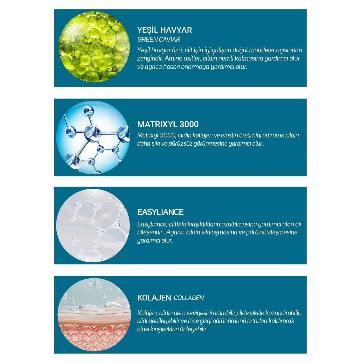 İçeriğinde bulunan yeşil havyar sayesinde hızlı lifting etkisi yapar. Cildi sıkılaştırarak pürüzsüz bir görünüm kazanmasına yardımcı olur.