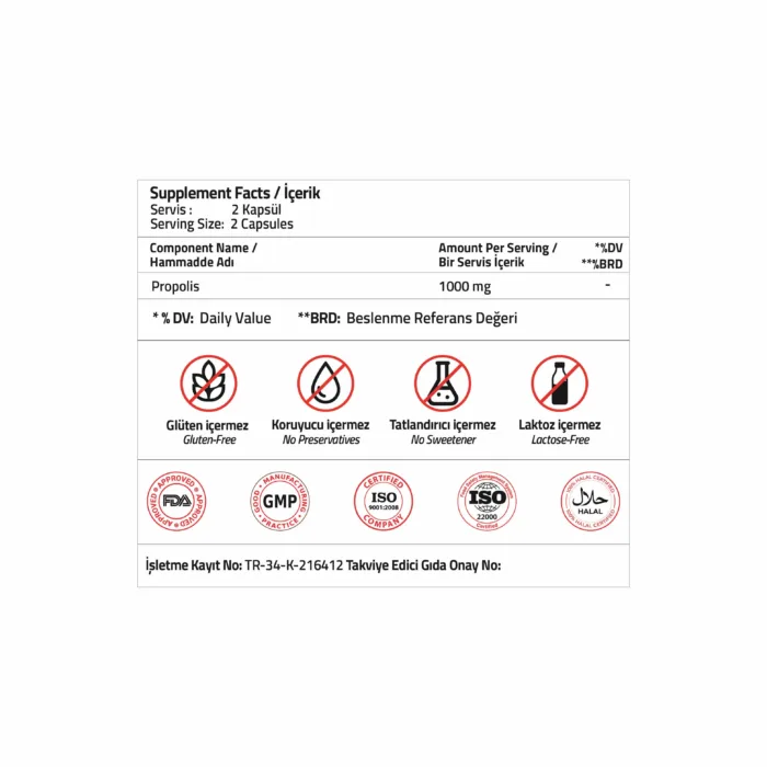 Propolis, Mikrokristalin Selüloz (E 460 (i)), Yağ Asitlerinin Magnezyum Tuzları: Magnezyum Stearat (E 470b), Silikon Dioksit (E 551), Kapsül Bileşeni (Hidroksipropil Metil Selüloz).