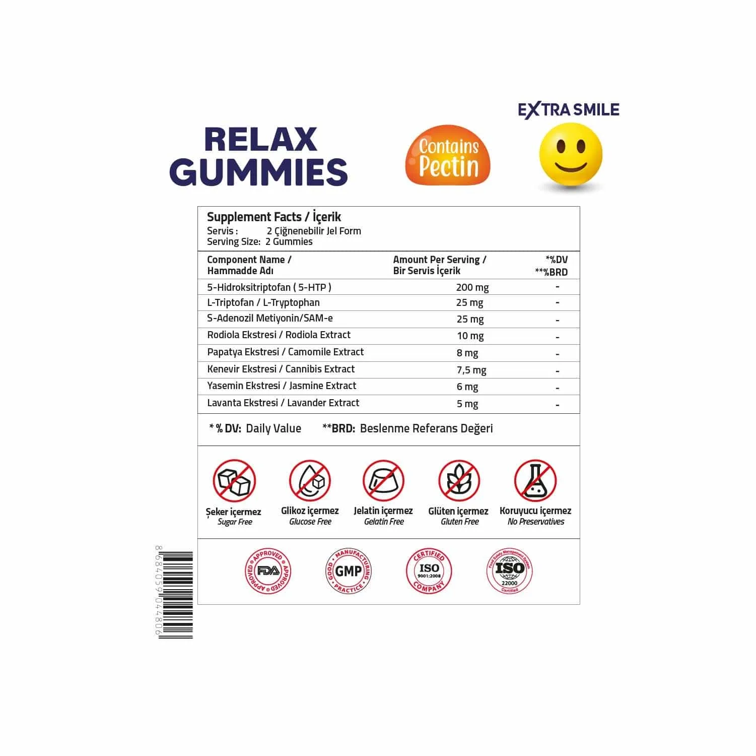 İçindekiler: Stabilizör: Maltitol, Deiyonize Su, 5-Hidroksitriptofan (5-http), Jelleştirici: Pektin, Asitlik Düzenleyici: Sitrik Asit, Aroma Verici: Elma Aroması, S-Adenozil Metiyonin/SAM-e, L-Triptofan, Tatlandıcırı: Sukraloz , Rodiola Ekstresi, Papatya Ekstresi, Kenevir Ekstresi, Yasemin Ekstresi, Lavanta Ekstresi, Renklendirici: Green S.