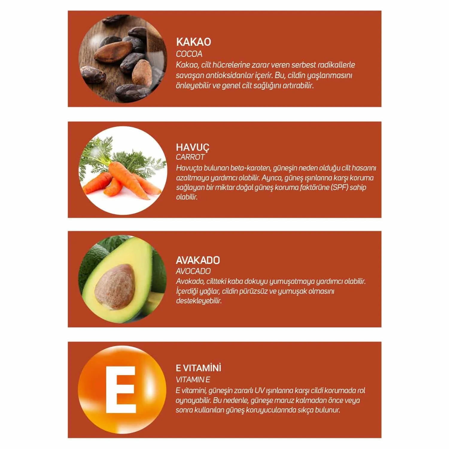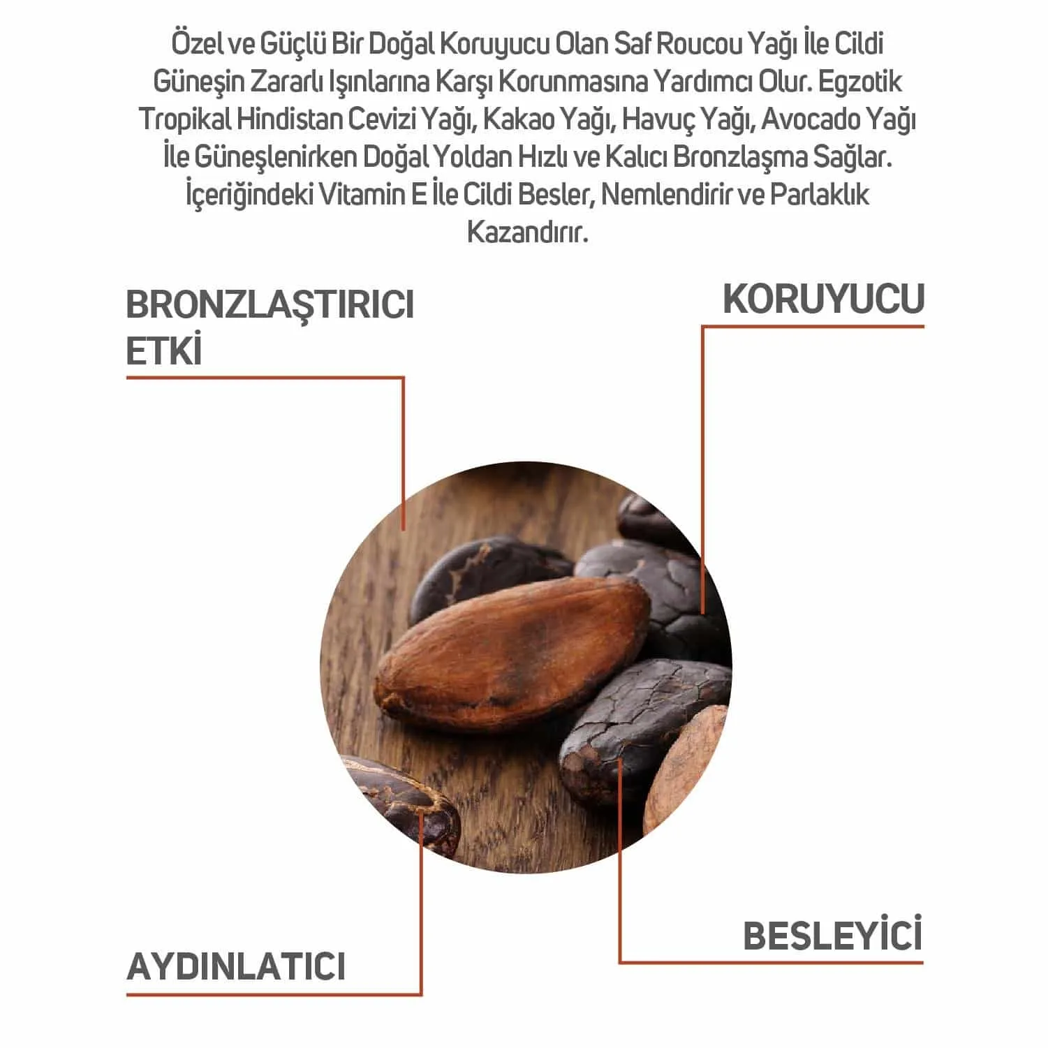 Özel ve güçlü bir doğal koruyucu olan saf Roucou yağı ile cildi güneşin zararlı ışınlarına karşı korunmasına yardımcı olur. Egzotik tropikal hindistan cevizi yağı, kakao yağı, havuç yağı, avocado yağı ile güneşlenirken doğal yoldan hızlı ve kalıcı bronzlaşma sağlar. İçeriğindeki vitamin E ile cildi besler, nemlendirir ve parlaklık kazandırır.