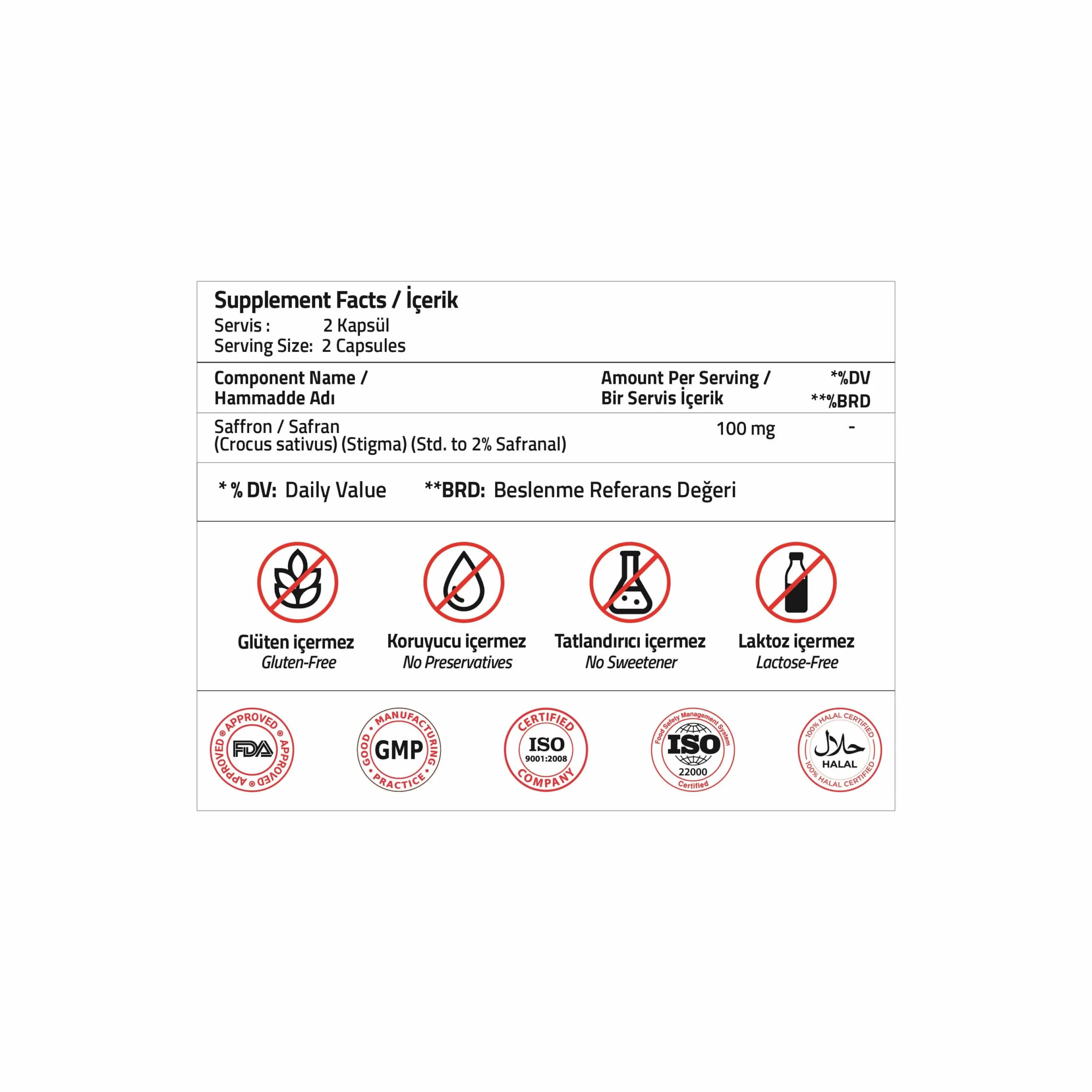 İçindekiler: Hacim Arttırıcı: Mikrokristalin Selüloz, Kapsül Bileşeni (Hidroksipropil Metil Selüloz), Safran Ekstresi, Topaklanmayı Önleyiciler: Yağ Asitlerinin Mg Tuzları, Silikon Dioksit.