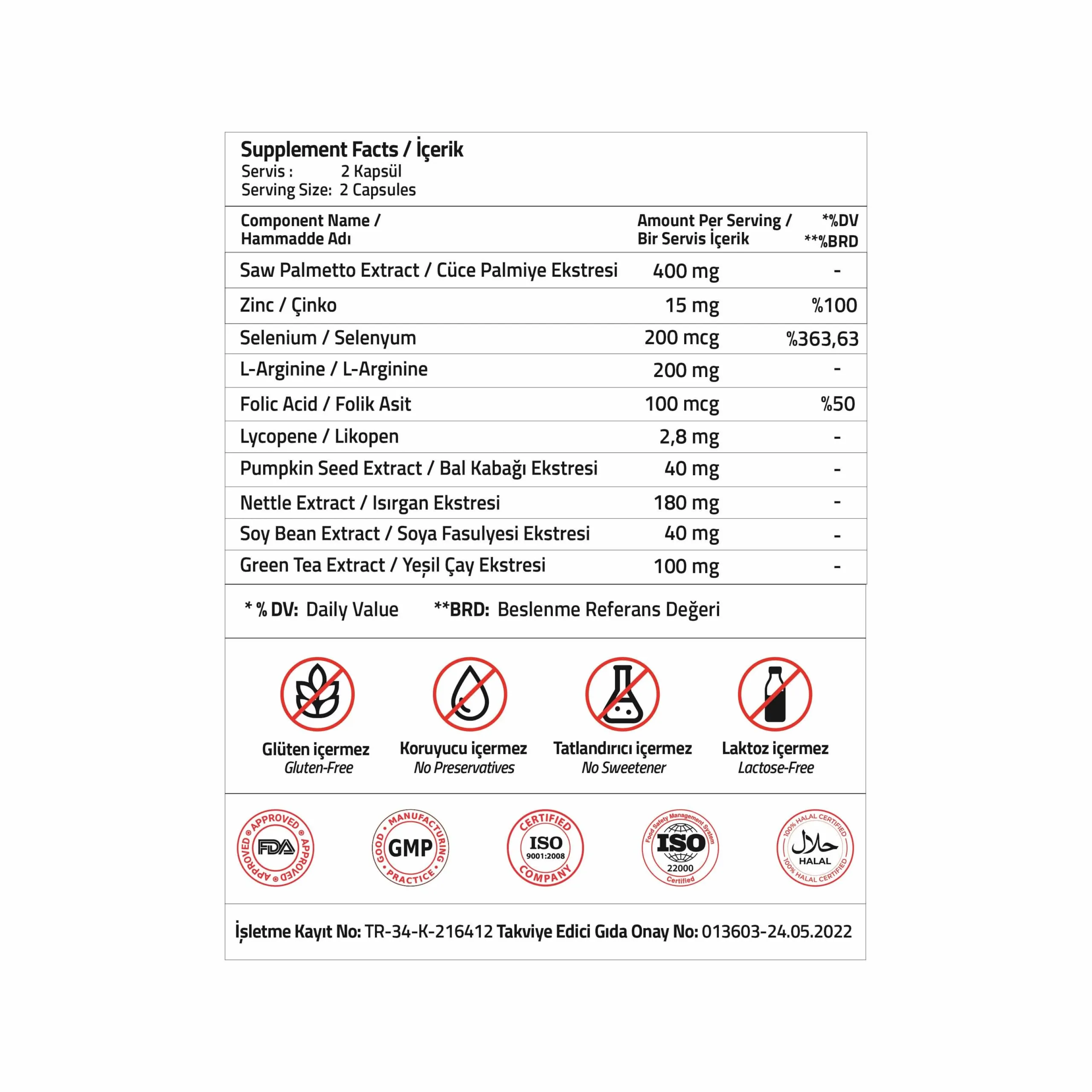 İçindekiler: Saw Palmetto (Cüce Palmiye) Ekstresi, L-Arjinin, Hidroksipropil Metil Selüloz, Isırgan Ekstresi, Yeşil Çay Yaprak Ekstresi, Çinko Sülfat Monohidrat, Balkabağı Ekstresi, Soya Fasulyesi Ekstresi, Yağ Asitlerinin Magnezyum Tuzları: Magnezyum Stearat, Silikon Dioksit, Likopen, Sodyum Selenit, Pteroilmonoglutamik Asit (Folat).