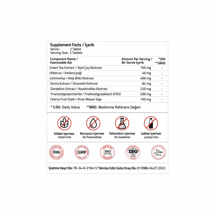 İçindekiler:  Hacim Arttırıcı (Mikrokristalin selüloz), Kelp Bitki Ekstresi, Sinameki Esktresi, Karahindiba Ekstresi, Fruktooligosakkarid (FOS), Yeşil Çay Ekstresi, Kiraz Meyve Sapı Ekstresi, stabilizör (polivinilpirolidon), Topaklanmayı önleyiciler (silikon dioksit, yağ asitlerinin magnezyum tuzları), Amberçiçeği Ekstresi. stresi.