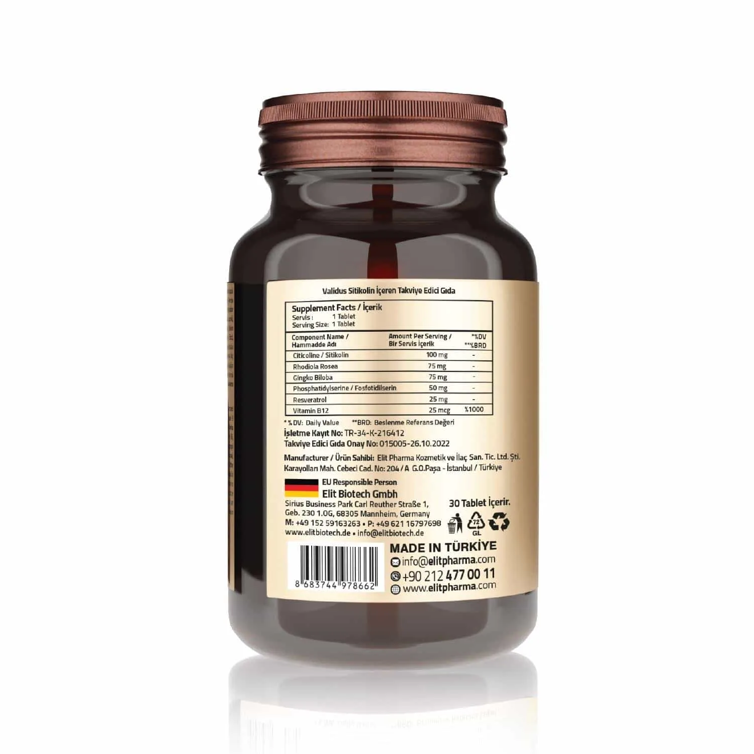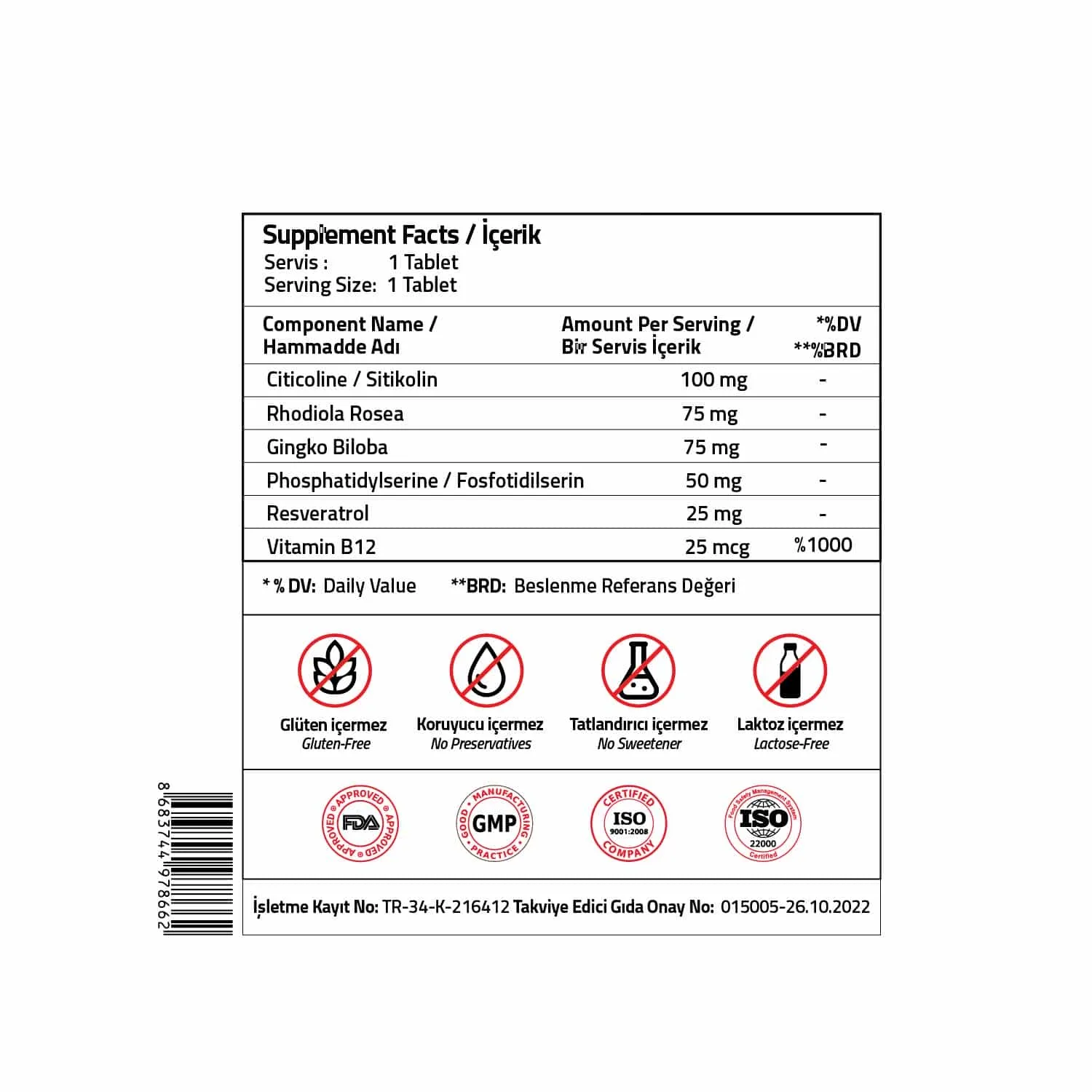İçindekiler: Hacim Arttırıcı (Mikrokristalin selüloz), Sitikolin, Rhodiola Rosea, Ginkgo Biloba Ekstresi, Fosfotidilserin, stabilizör (polivinilpirolidon) Resveratrol, Topaklanmayı önleyiciler (silikon dioksit, yağ asitlerinin magnezyum tuzları), Metilkobalamin.