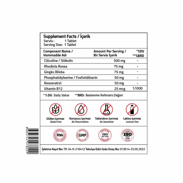 Hacim Arttırıcı (Mikrokristalin selüloz), Sitikolin, Rhodiola Rosea, Ginkgo Biloba Ekstresi, Fosfotidilserin, stabilizör (polivinilpirolidon) Resveratrol, Topaklanmayı önleyiciler (silikon dioksit, yağ asitlerinin magnezyum tuzları), Metilkobalamin.