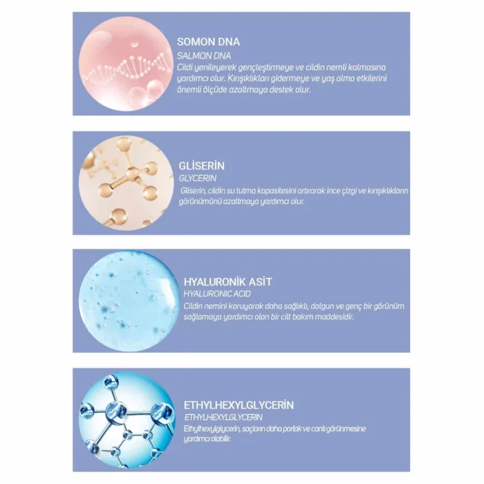 İçeriğinde bulunan %10 Somon DNA ile yaşlanma etkilerini azaltarak cildin yenilenmesine yardımcı olur.