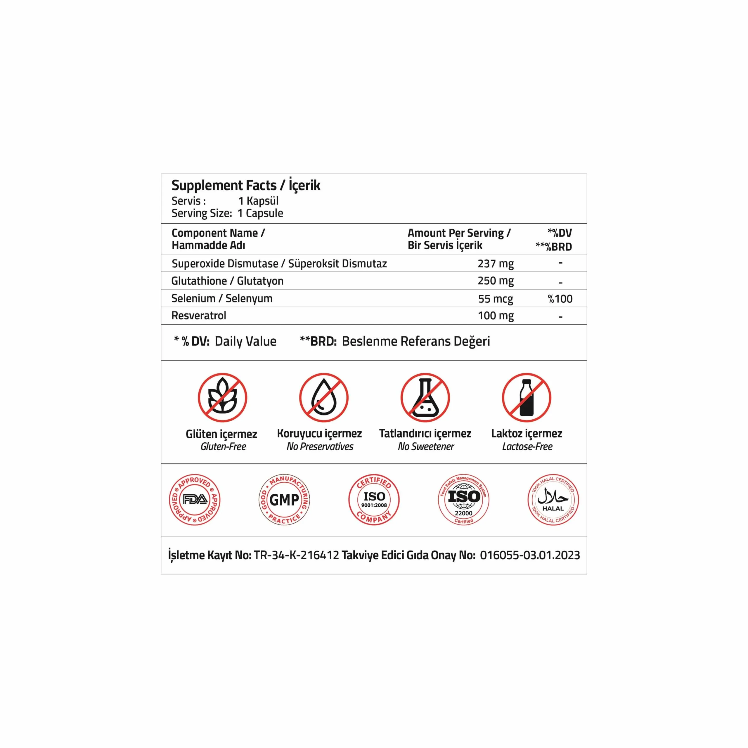 İçindekiler: Süperoksit Dismutaz, Glutatyon, Sodyum Selenit, Resveratrol, Kapsül Bileşeni (Hidroksipropil metil selüloz, Su, Agar, Karagenan, Sodyum Sitratlar), Hacim Arttırıcı (Mikrokristalin selüloz), Topaklanma önleyici maddeler, (silikon dioksit, yağ asitlerinin magnezyum tuzları).