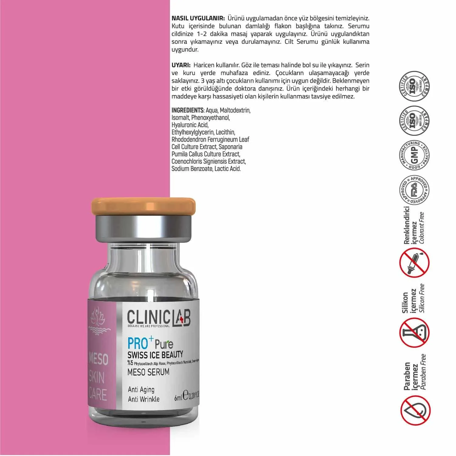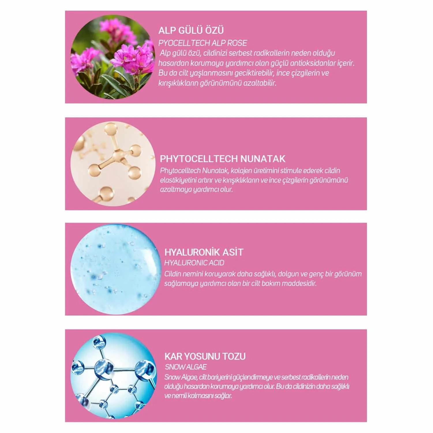İÇİNDEKİLER : Aqua, Maltodextrin, Isomalt, Phenoxyethanol, Hyaluronic Acid, Ethylhexylglycerin, Lecithin, Rhododendron Ferrugineum Leaf Cell Culture Extract, Saponaria Pumila Callus Culture Extract, Coenochloris Signiensis Extract, Sodium Benzoate, Lactic Acid.