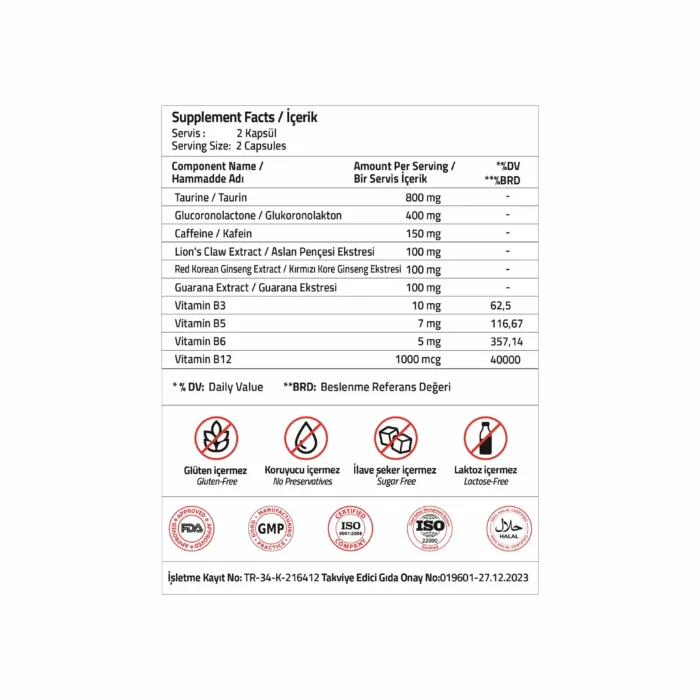 Taurin, Glukoronolakton, Kafein, Aslan Pençesi Ekstresi, Kırmızı Kore Ginseng Ekstresi, Guarana Ekstresi, Nikotinamid, Yağ Asitlerinin Magnezyum Tuzları: Magnezyum Stearat (E 470b), Mikrokristalin Selüloz (E 460 (i)), D-Pantotenat Kalsiyum, Piridoksin Hidroklorür, Silikon Dioksit (E 551), Metilkobalamin, Kapsül Bileşeni (Hidroksipropil Metil Selüloz).