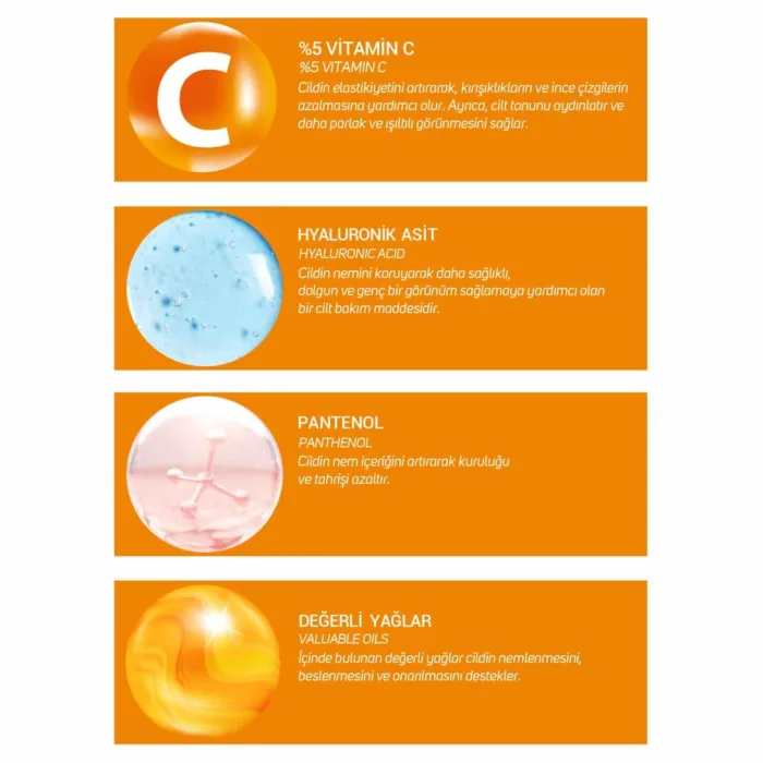 İçeriğinde bulunan %5 Vitamin C ve diğer bileşenler sayesinde dış etkenlerden kaynaklanan oksidasyonunu azaltarak cildin canlı, parlak ve pürüzsüz görünmesine yardımcı olur.
