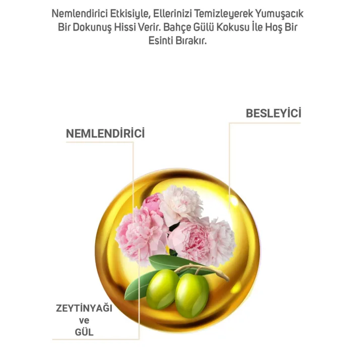 Nemlendirici etkisiyle, ellerinizi temizleyerek yumuşacık bir dokunuş hissi verir. Zeytinyağı & Bahçe Gülü Özlü kokusu ile de hoş bir esinti bırakır.